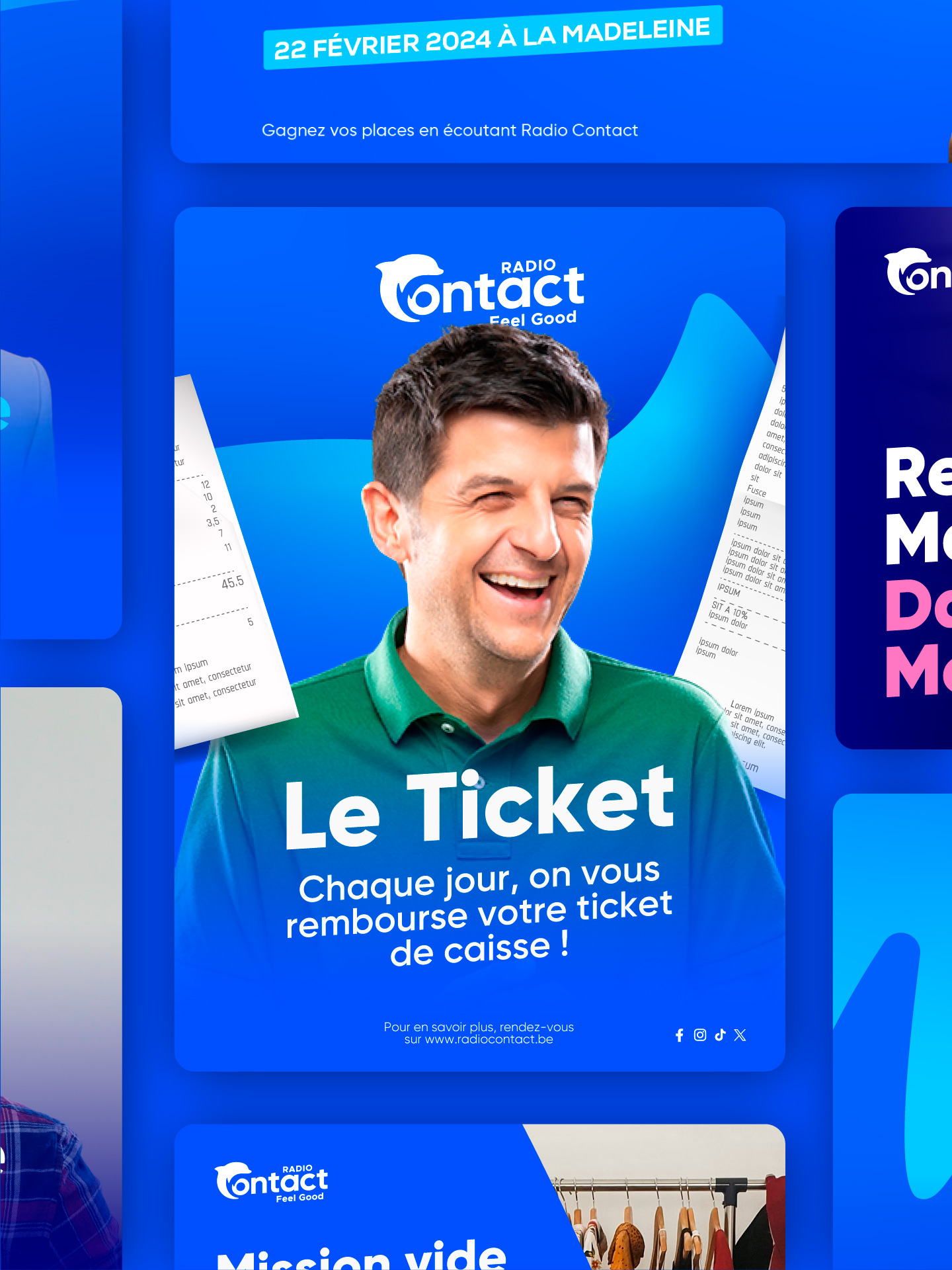 L’ensemble de l’identité visuelle découle d’une harmonie entre les différents éléments qui la composent. Les courbes du dauphin Contact prennent une place importantes dans l’ensemble de l’univers graphique de la marque pour que ses visuels puissent être reconnaissables et identifiables avec facilité comme étant Radio Contact.